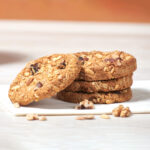 Galleta de avena con maní y nueces, sabor almendra. Elaborada a base de plantas. Apto Vegano.